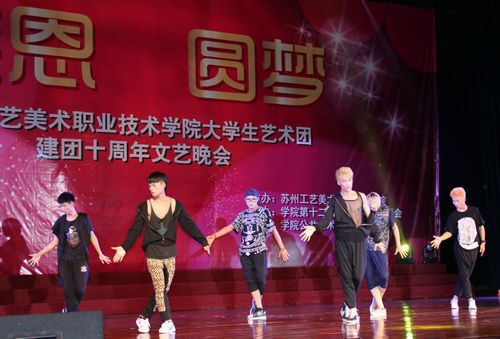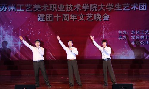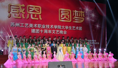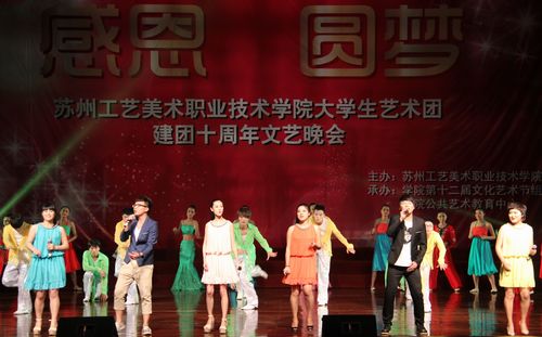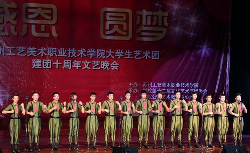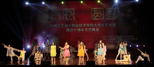 苏州工艺美术职业技术学院大学生艺术团成立于2002年,是学院28365net具体负责的院级学生艺术社团。建团十年来,通过专业化队伍管理、专业化训练方式,使学院艺术团的整体艺术水平迅速提升。在学院的支持下,凭借专业团队、专项经费、专用场馆和专项活动的有效支撑,使大学生艺术团成为学院校园文化活动的核心力量。大学生艺术团设有声乐队、舞蹈队、曲艺队,肩负着对外演出、比赛、交流及开展校园文化活动等主要任务,在提高学生艺术素养,倡导高雅艺术,丰富校园文化生活的工作中发挥了重要作用,是学生施展艺术才华、进行艺术实践的重要舞台。十年磨砺、铸就辉煌,我们将用汗水去浇灌下一个十年,用热情去实现新的梦想!