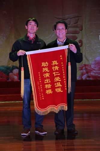演出过程中,艺术团团长代表残艺团赠送了我院一面锦旗“真情仁爱温暖、助残演出楷模”,真诚感谢学院长期以来对残疾人事业的关注与支持,学院党委委员陈俊上台接受了锦旗。